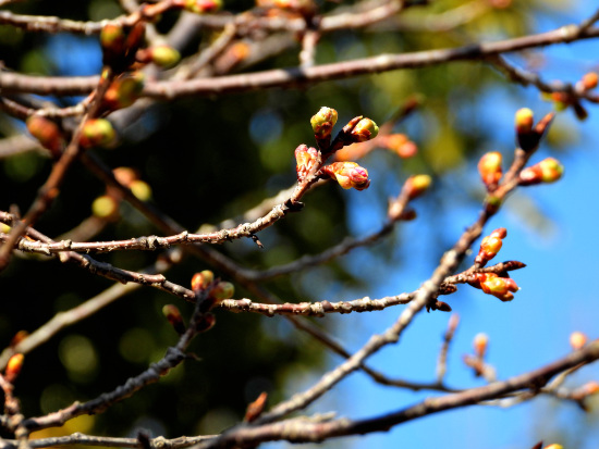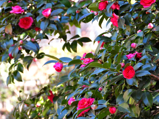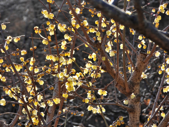 梅林の周りの蝋梅が満開に近く甘い香りを放しています。椿園では椿が多く咲いており、ハス田の寒桜はまだ蕾で一輪も咲いていませんでした。