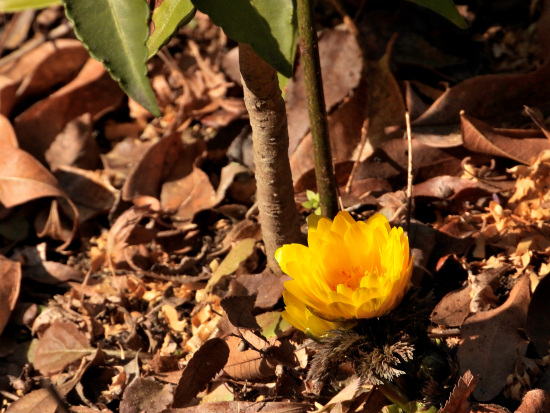 旧永井家の庭に毎年咲いていた福寿草が見当たりませんでしたが萬葉草花苑に一本だけ咲いていました。
